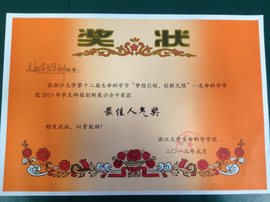 实验室获得生科院2013年学生科技创新展示会最佳人气奖!